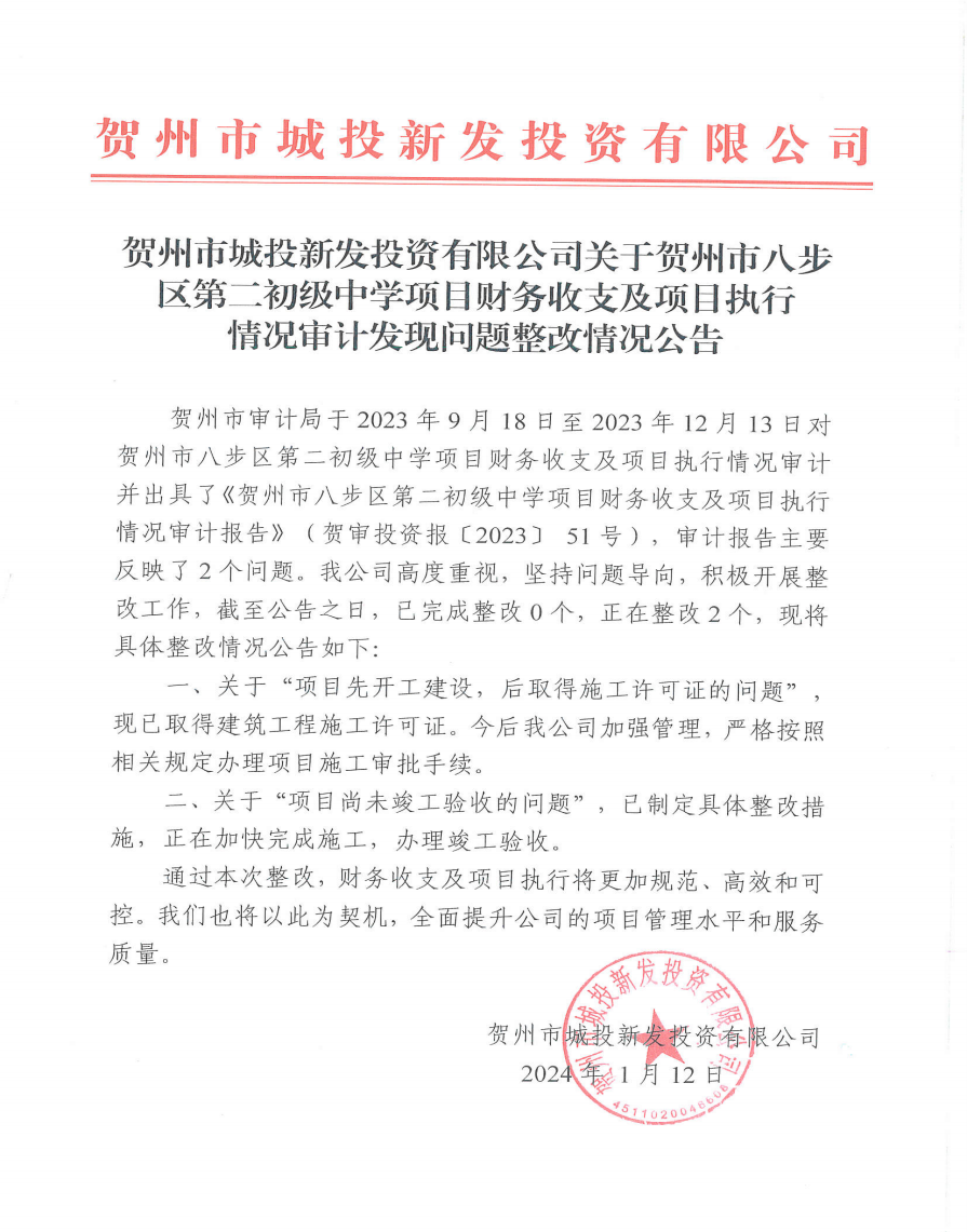 關于賀州市八步區第二初級中學項目財務收支及項目執行情況審計發現問題整改情況公告