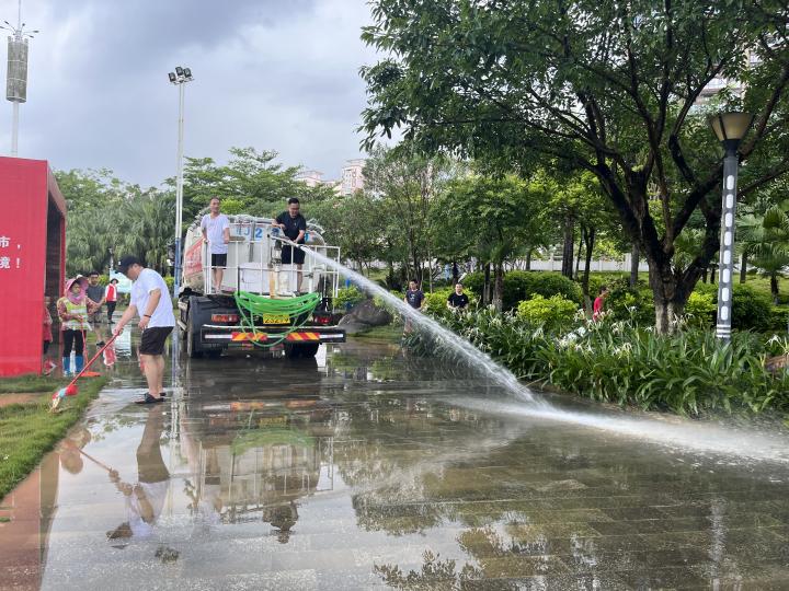 本次清理行動分兩組進行,一是加大路面保潔作業力度,對散落的樹枝、落葉及洪水攜帶上來的雜物進行清理。二是人機結合,采取“沖洗+洗掃”聯合作業方式,對林蔭小道路面、公園廣場等地進行深度沖洗,徹底消除洪水沉積淤泥。